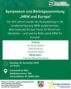 „Europa macht Menschen glücklich!“ wird von der Landesinitiative Europa-Schecks des Ministers für Bundes- und Europaangelegenheiten, Internationales sowie Medien und Chef der Staatskanzlei des Landes Nordrhein-Westfalen unterstützt.