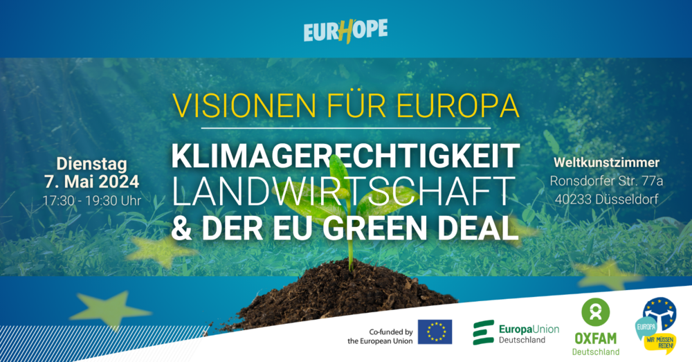 Gemeinsam mit Oxfam Deutschland laden wir Sie herzlich zum Bürgerdialog „Visionen für Europa: Klimagerechtigkeit, Landwirtschaft und der EU Green Deal“ ein, der am Dienstag, den 7. Mai 2024 im Weltkunstzimmer in Düsseldorf stattfindet.
