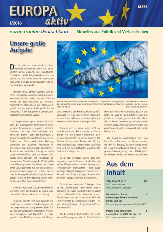 In der neuen Ausgabe unserer Mitgliederzeitschrift finden Sie den Kommentar „Unsere große Aufgabe“ von EUD-Präsident Rainer Wieland und Generalsekretär Christian Moos. Weitere Beiträge befassen sich mit der Verantwortung Europas in der Flüchtlingspolitik und der Frage der Menschenrechte in den europäisch-türkischen Beziehungen. Die JEF berichtet von ihrer europaweiten Aktionswoche #DontTouchMySchengen für offene Grenzen in der EU.