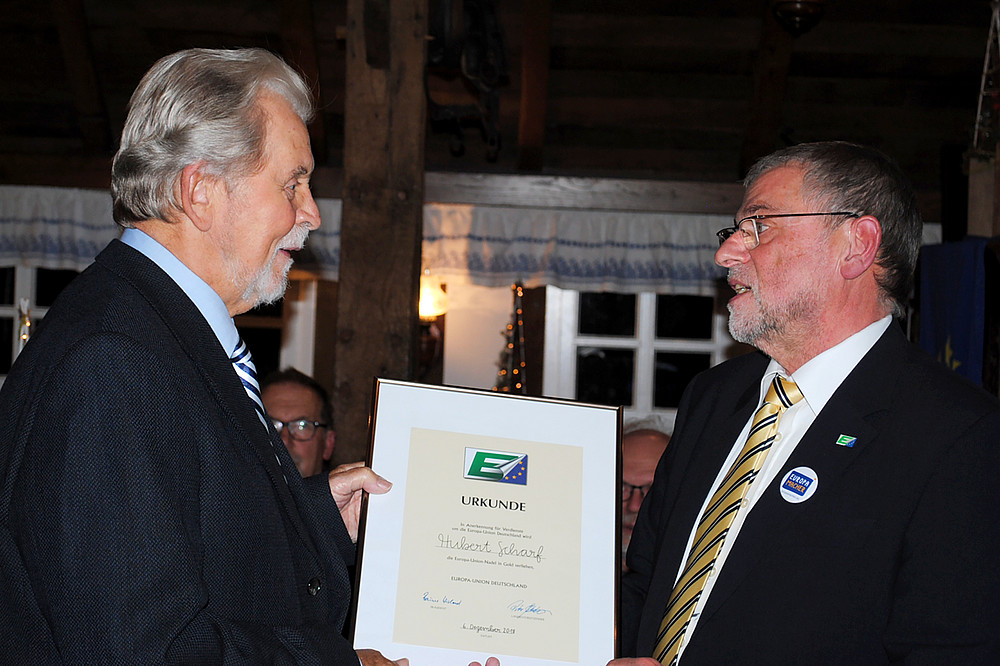 Im Frühjahr dieses Jahres gab er den Vorsitz des EUD-Kreisverbandes an Dr. Angelika Kordfelder ab. Hubert Scharf warnte in seinen Dankesworten vor einem zerstrittenen Europa, das kein Gewicht in der Weltpolitik mehr haben werde. Sein Wunsch ist es, die Friedensdividende Europas fortzuschreiben, denn „der Friede ist das Beste aller Dinge“.