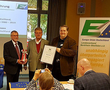 Es folgten die Berichte des Landesvorstands, Antragsdebatten und die Ehrung verdienter Mitglieder. Unter letztem Tagesordnungspunkt wurde Gabriele Racka-Watzlawek von Peter W. Wahl für ihr langjähriges Engagement in Solingen mit der Ehrennadel der Europa-Union Deutschland geehrt. Frau Racka-Watzlawek übt seit mehr als 30 Jahren das Amt der Vorsitzenden der Europa-Union Solingen aus, veranstaltet vor Ort zahlreiche Veranstaltungen mit Europabezug und hat sich viele Jahre auch im Landesvorstand der Europa-Union NRW ehrenamtlich eingebracht.