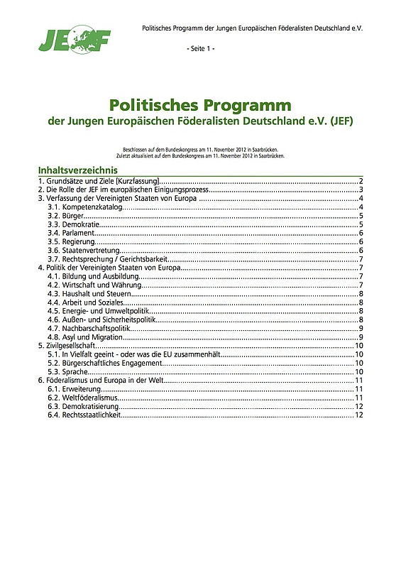 Das Politische Programm fasst die wesentlichen Positionen der JEF in einer einfachen und verständlichen Weise zusammen. Das Hertensteiner Programm von 1946 bleibt weiterhin Grundlage der Arbeit der JEF – das Politische Programm ergänzt und konkretisiert es; es begründet und wirbt für unsere föderalistischen Positionen. Dabei weichen wir kontroversen Fragen, die eine besondere Bedeutung für unsere Vision des europäischen Bundesstaats haben, nicht aus.