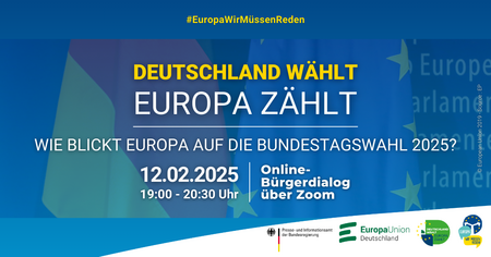 Herzliche Einladung zu unserem Online-Bürgerdialog "Deutschland wählt, Europa zählt! Wie blickt Europa auf die Bundestagswahl 2025?" am 12. Februar 2025.