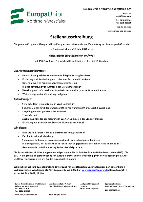 Die gemeinnützige und überparteiliche Europa-Union NRW sucht zur Verstärkung der Landesgeschäftsstelle in Dortmund ab dem 16. Mai 2022 eine