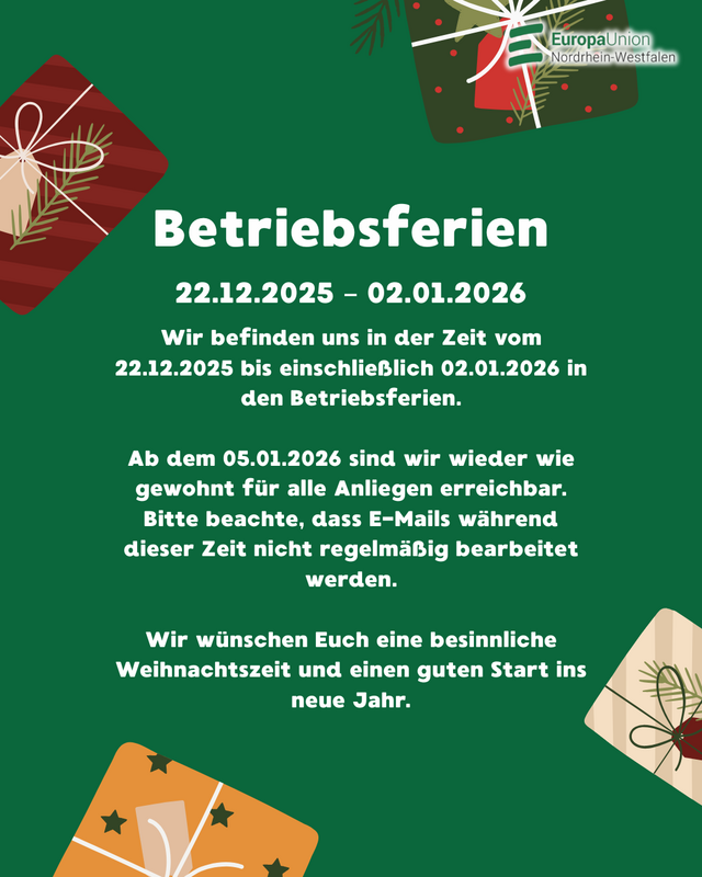 Die Geschäftsstelle der Europa-Union NRW befindet sich vom 22.12.2025 bis zum 02.01.2026 in der Winterpause und ist in der Zeit nicht zu erreichen. Ab dem 05.01.2026 sind wir wieder wie gewohnt für sie da.