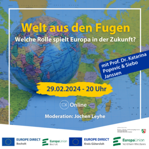 Zu einer Online-Diskussion im Rahmen des Projekts Zukunft Europas läd die Europa-Union NRW gemeinsam mit dem Kreisverband Bocholt und den EUROPE DIRECT Informationszentren Gütersloh und Bocholt interessierte Bürgerinnen und Bürger am Donnerstag, 29. Februar, ein. Thema ist die Rolle Europas in der Zukunft . Beginn ist um 20 Uhr. Die Teilnahme ist kostenfrei.