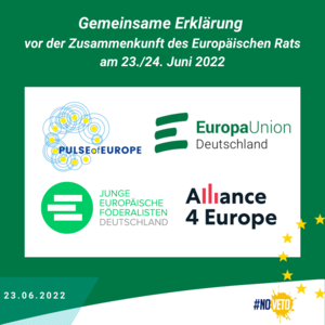 Vor der Tagung des Europäischen Rats am 23./24. Juni appellieren Pulse of Europe, Europa-Union Deutschland, JEF Deutschland und Alliance4Europe an die deutsche Bundesregierung, an ihren im Koalitionsvertrag festgeschrieben europapolitischen Zielen festzuhalten. Erklärtes Ziel der Bundesregierung war die Einberufung eines Europäischen Konvents mit dem Ziel, Vertragsreformen herbeizuführen, die geeignet sind, die Handlungsfähigkeit der Europäischen Union zu erhöhen und insbesondere die aus dem Einstimmigkeitsprinzip resultierenden…