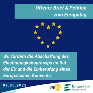 „Das nationale Veto im Rat der Europäischen Union muss abgeschafft werden und durch die Beschlussfassung mit qualifizierter Mehrheit ersetzt werden!“ Mit dieser Forderung, die auch von der Konferenz zur Zukunft Europas gestellt wird, wendeten sich EUD-Präsident Rainer Wieland und JEF-Bundesvorsitzende Clara Föller gemeinsam mit den Spitzen unserer Partnerorganisationen der #NoVeto-Kampagne am heutigen Europatag an die Präsidentinnen und Präsidenten der europäischen Institutionen. Zeichnen Sie den offenen Brief als Petition mit!
