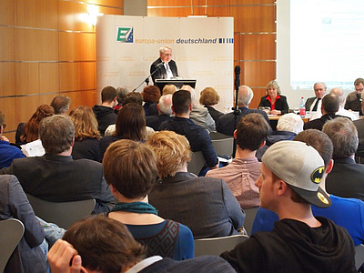 Noch unter dem Eindruck der vorangegangenen „Nacht von Paris“ kamen fast 100 Delegierte und Gäste der Europa-Union NRW in Köln zusammen. Zu Vortrag und Diskussion war der Europaabgeordnete und UEF-Präsident Elmar Brok angereist und hatte gleich auch noch den bulgarischen Parlamentskollegen Dr. Andrey Kovatchev auf das Podium mitgebracht.